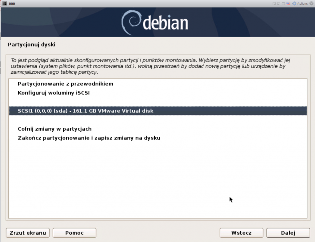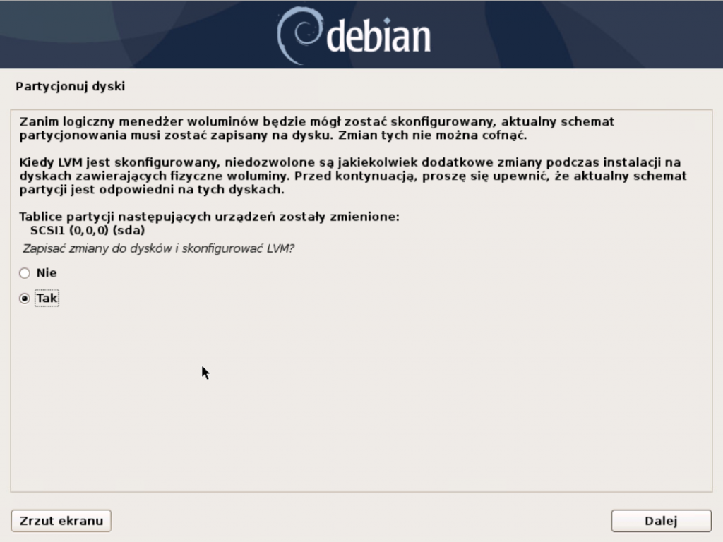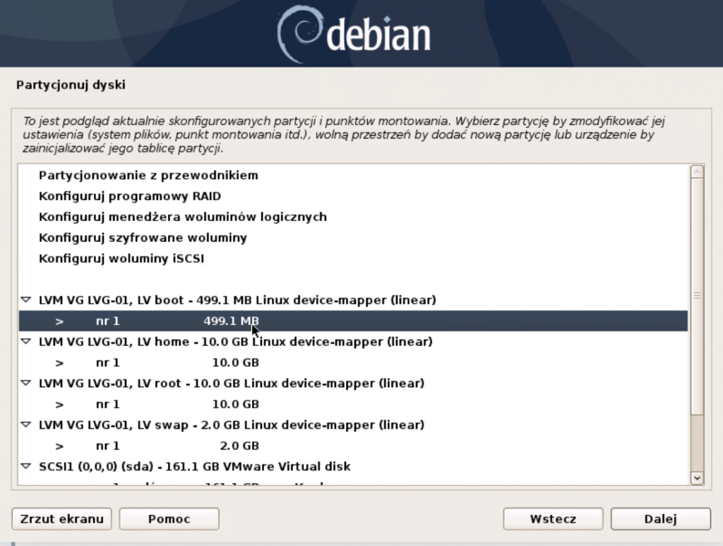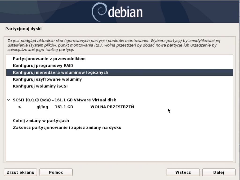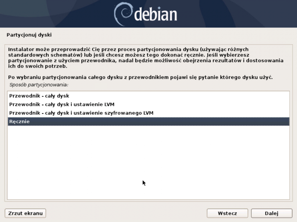 24 lutego, 2020Hartowanie Bustera zaczyna się na samym początku instalacji czyli w chwili kiedy podejmujemy decyzje co zrobić z dyskiem / dyskami twardymi zainstalowanymi w maszynie. Od dłuższego czasu w swoich systemach stosuję LVM, który posiada szereg zalet. Podstawową zaletą jest jego elastyczność znacznie większa niż standardowych partycji. Można z dowolnej liczby dysków tworzyć duże dyski logiczne. Można zmieniać wielkości woluminów logicznych niezależnie od kolejności na dyski. W wypadku zwiększania partycji nie ma potrzeby „organizowania” wolnego miejsca w sąsiedztwie powiększanej partycji. A przede wsztkim główną zaletą jest proste robienie migawek systemu bez zatrzymywania usług. Jak skonfigurować LVM w czasie instalacji Debiana? Gdy w trakcie instalacji systemu dochodzimy do okna gdzie będziemy zajmować się podziałem dysku należy wybrać konfigurację ręczną.