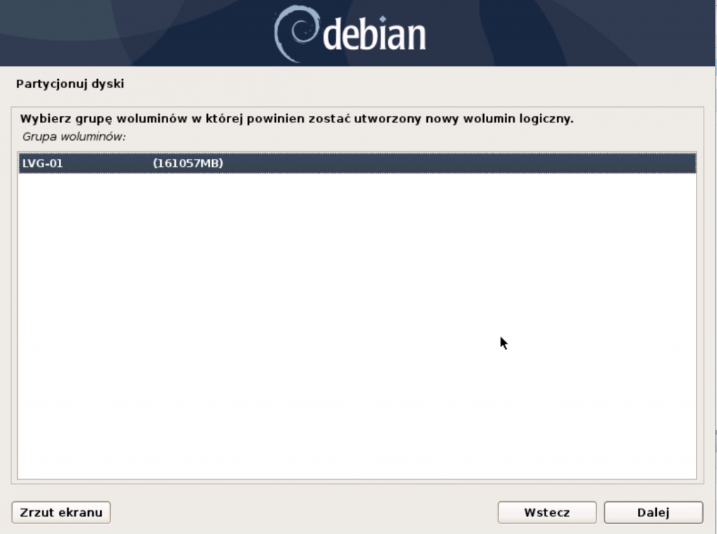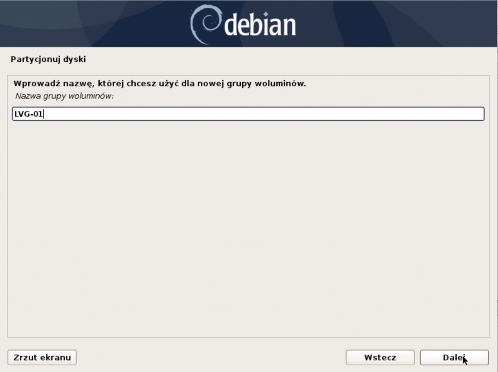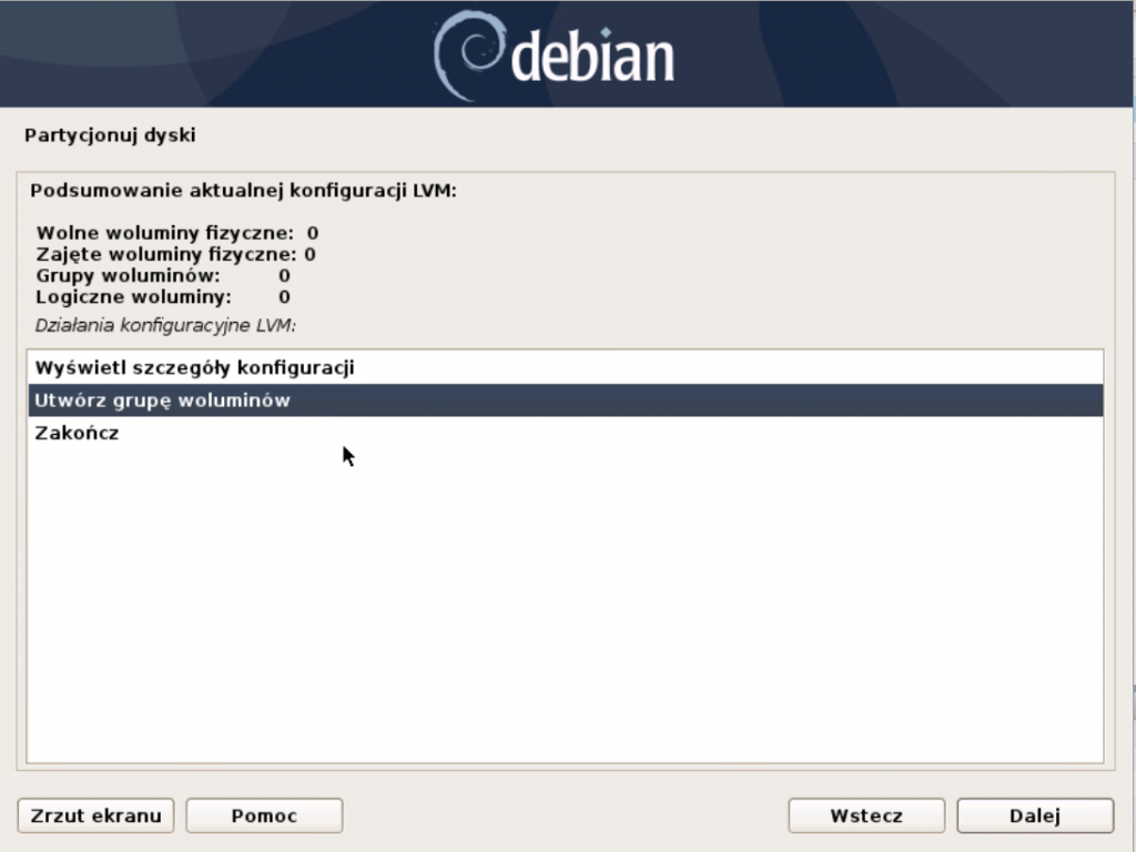Przyszedł czas na utworzenie grupy woluminów. Dalej
