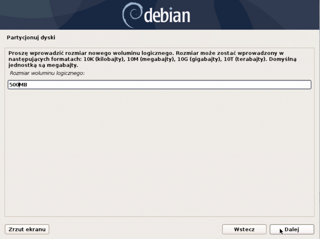 Kolejny krok to ustalenie wielkości woluminu. Dla partycji /boot 500MB to aż nadto ale lubię okrągłe liczby 😉 Tradycyjnie Dalej.