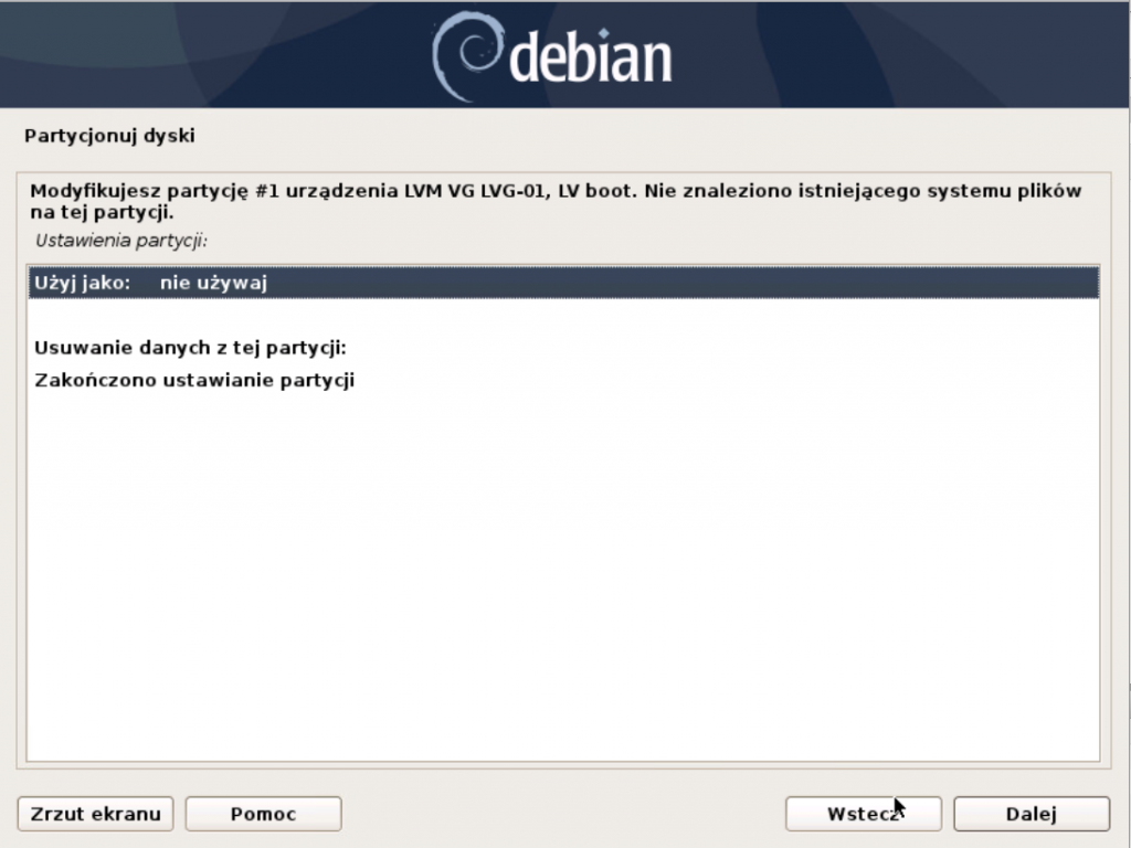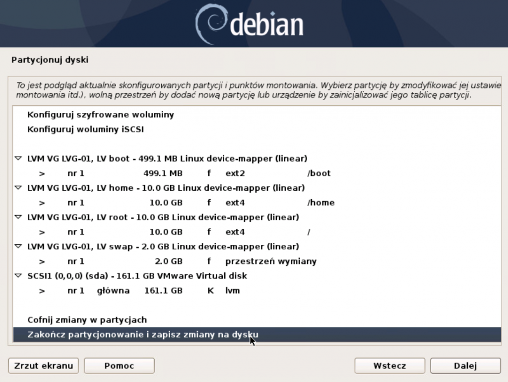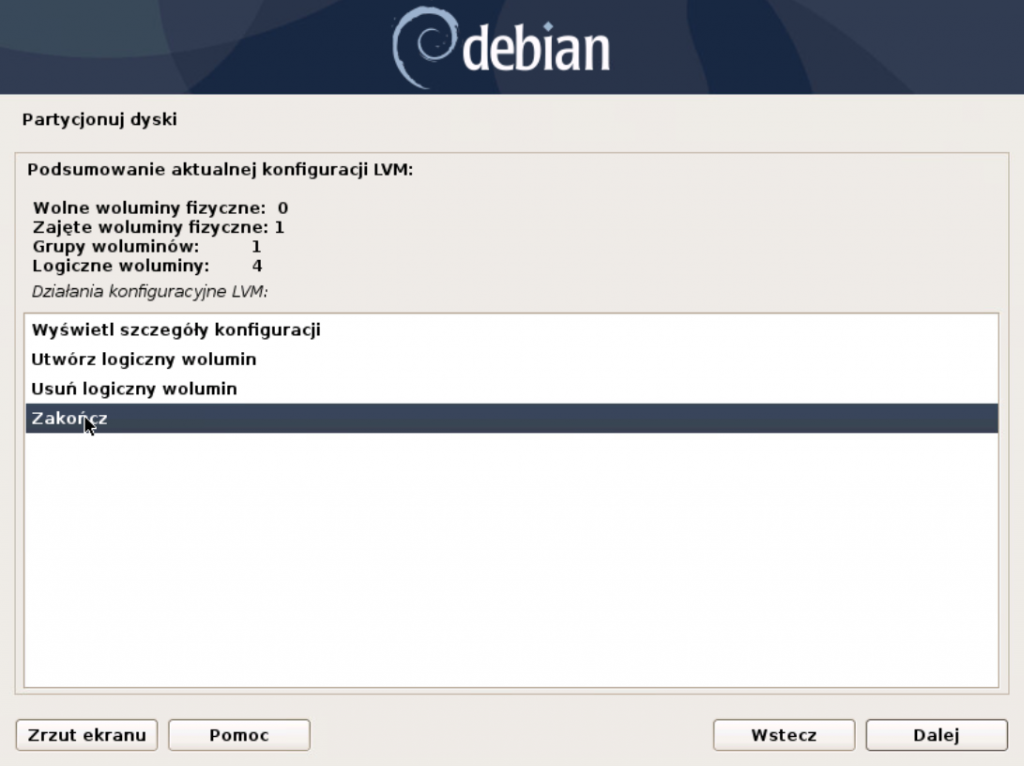 Po zakończeniu stawiania wszystkich woluminów naciskamy Zakończ. Ponieważ ten wpis ma jedynie pokazać ja się tworzy LVM i partycjonowanie z LVM więc ja zrobiłem jedynie podstawowe partycje.