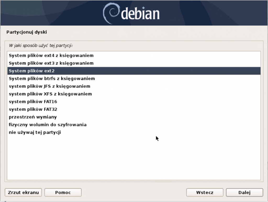 Partycja /boot więc można wybrać ext2 choć i na ext4 zadziała