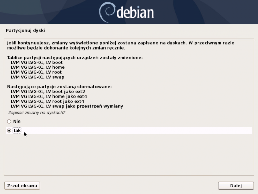 Jak wszystkie konieczne partycje zostaną ustawione zakańczamy partycjonowanie i zapisujemy zmiany na dysku.