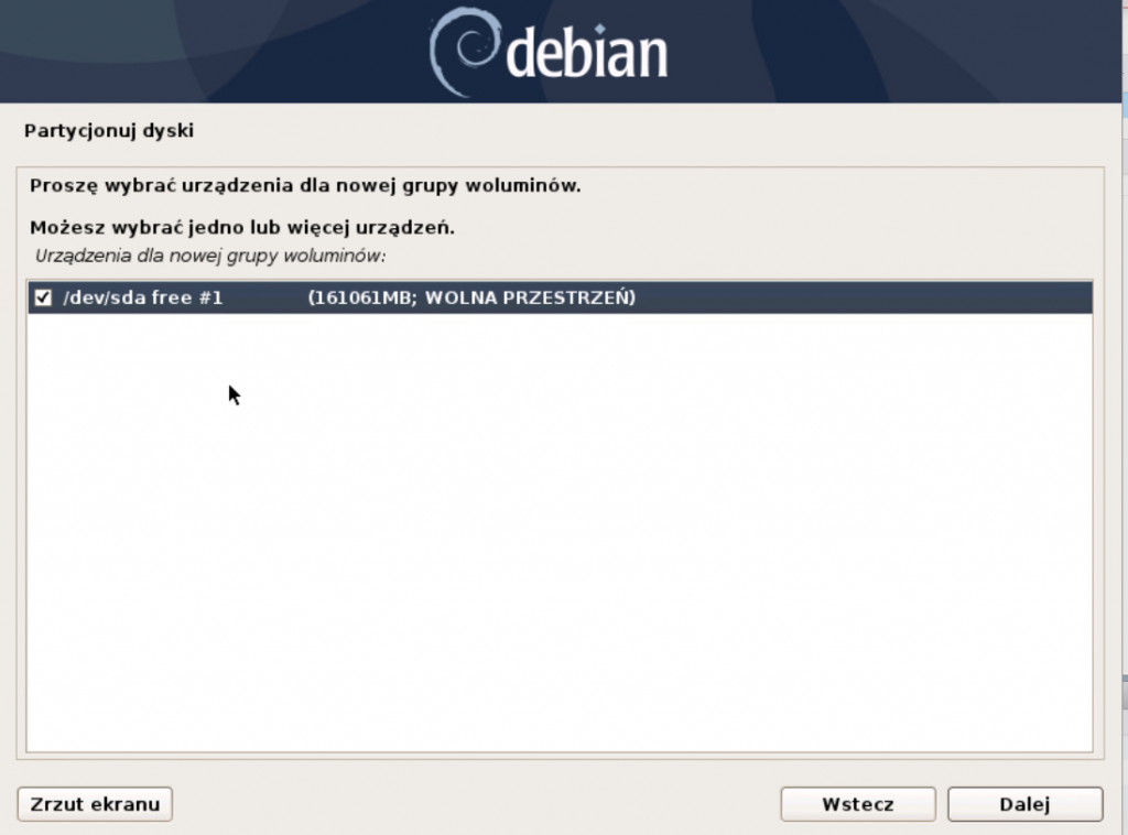 Wskazujemy przestrzeń, która będziemy obejmować LVM (w moim przypadku będzie to cały dysk), kikamy Dalej.